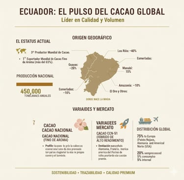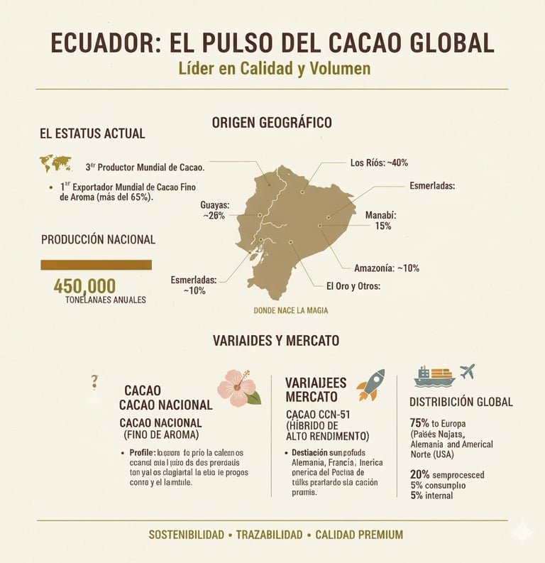 Comercio internacional de cacao ecuatoriano con trazabilidad, cumplimiento normativo y logística global.